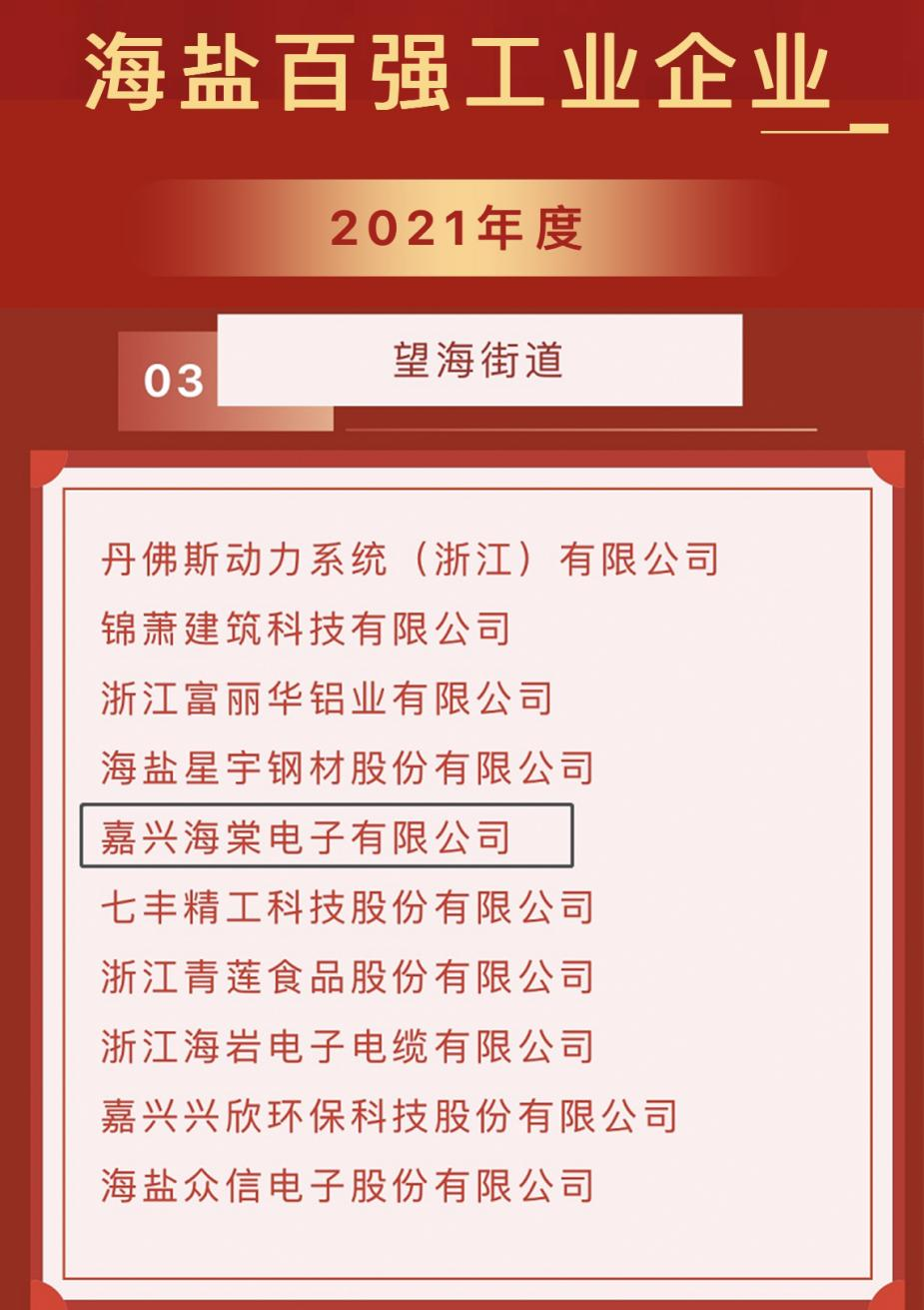 嘉興海棠電子再次獲得“縣工業(yè)百強企業(yè)”殊榮。這是海鹽從2012年開始公開發(fā)布百強工業(yè)企業(yè)名單的第10個年頭。嘉興海棠電子也是從2012起,已連年獲得“縣工業(yè)百強企業(yè)”的榮譽。