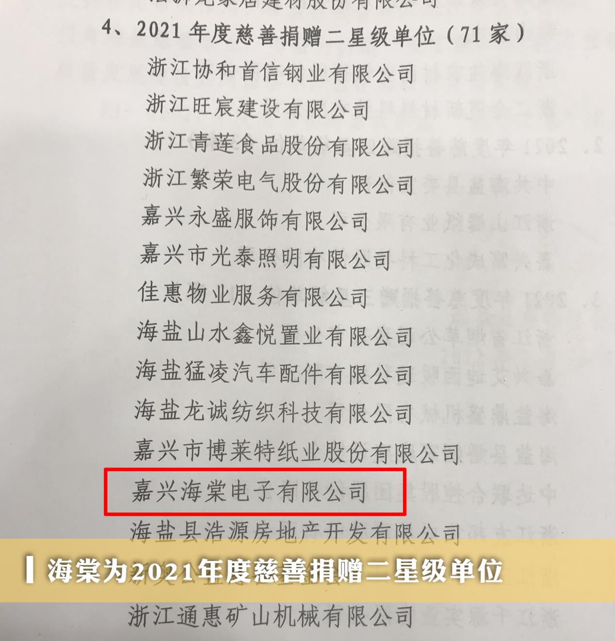 嘉興海棠電子獲得第五屆“海鹽慈善獎”2021年度慈善捐贈二星級單位,嘉興海棠電子將繼續(xù)保持善舉,貢獻企業(yè)的一份愛心力量。
