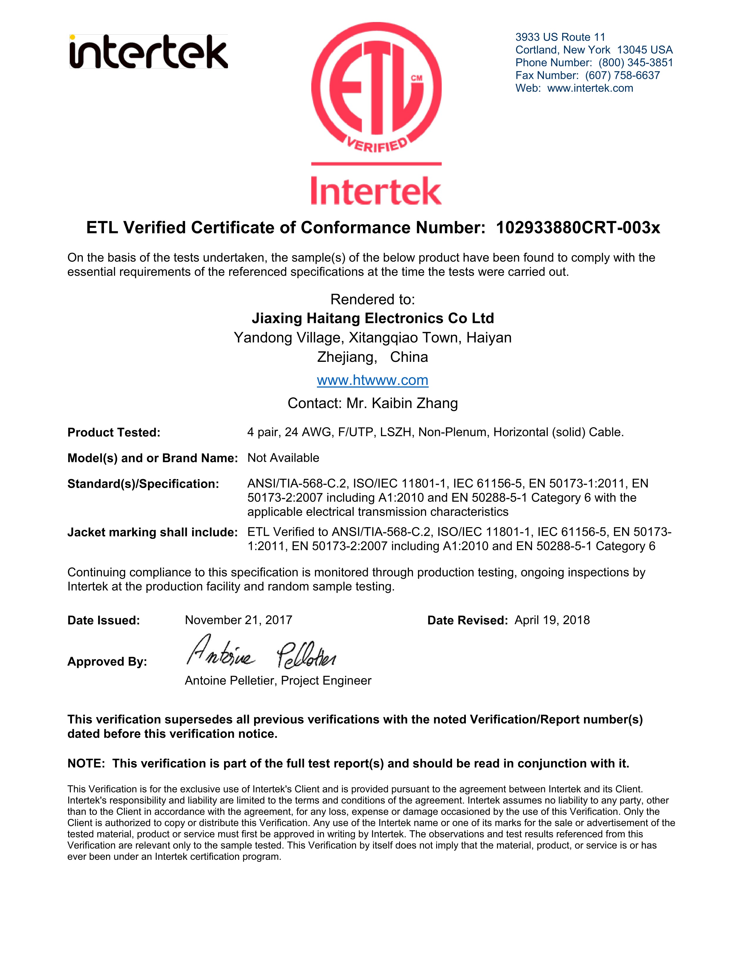 FUTP CAT6 24AWG LSZH ETL性能認(rèn)證